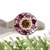 Hand set natural orange and red Sapphires and Garnet centre. All set in solid sterling silver which is brushed for the antique, unique look.