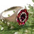 This hand engraved in Sterling Silver with a cabochon Garnet center is perfect for everyday wear with a lovely glow to it.